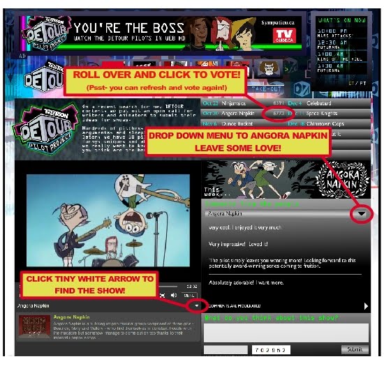 Hey gang, you can still check out the Angora Napkin pilot online, cast your vote and shower Teletoon with heaps of love for the show! Here's some handy links: